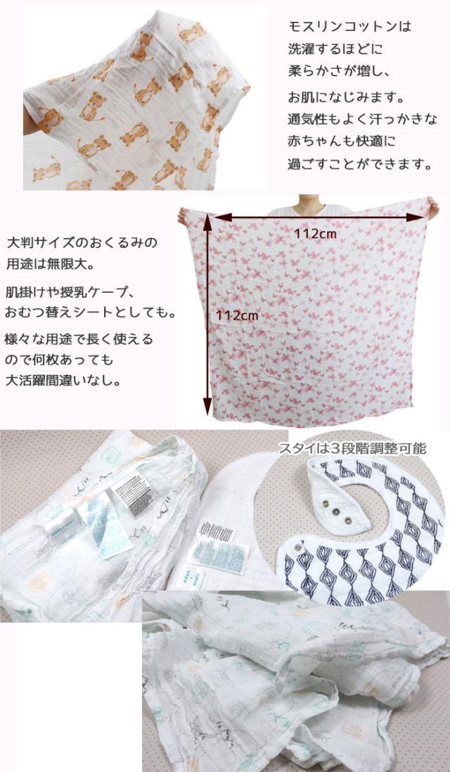 モスリンコットンを使用し生地は柔らかく、赤ちゃんをやさしく包み込みます。 授乳ケープ、バスタオル、ブランケット、ベビーカーの日よけ、 オムツ替え時のシートまで、幅ひろい用途で使用できます。 同じく大人気のスタイ(よだれかけ)もおくるみと同じモスリンコットンを使用し 生地は柔らかく丈夫で洗濯機で洗える素材。 お洗濯の多いベビー用品には最適です。 またモスリンコットンは洗うたびに柔らかくなり、肌ざわりが良いという特性があります。