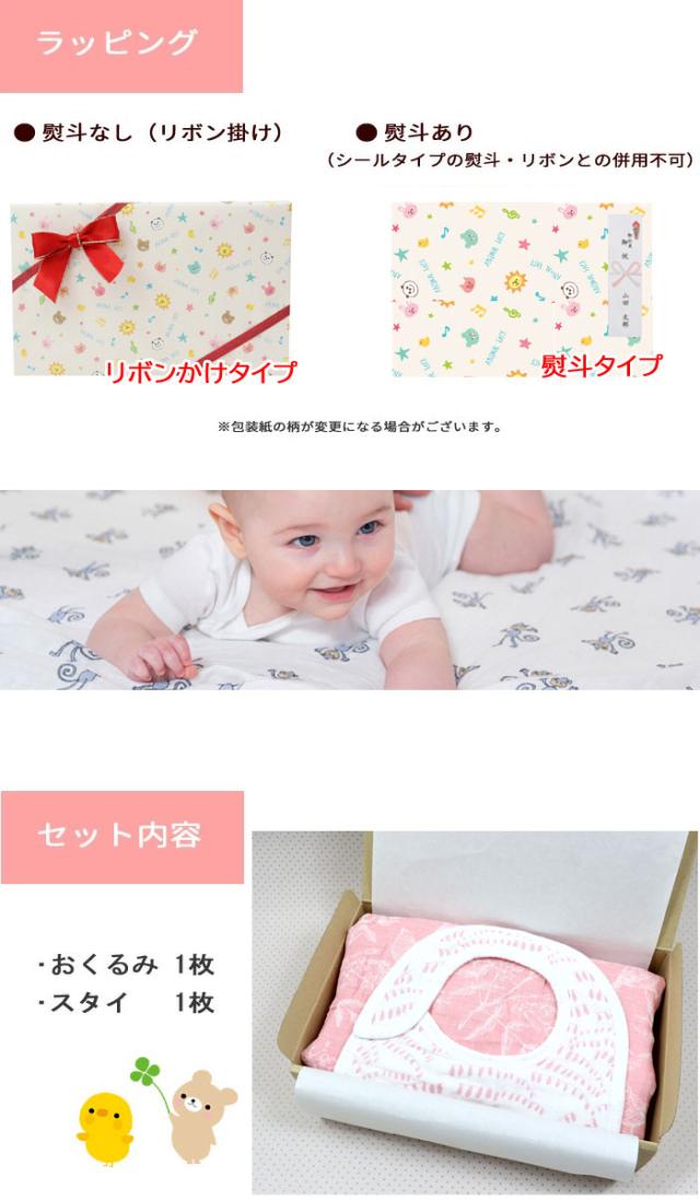 セット内容おくるみ1枚とスタイ1枚を当店オリジナルボックスに入れてお包みします。