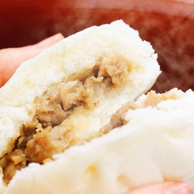 【原材料】具材(豚肉(国産)、玉葱(国産)、醤油、砂糖、発酵調味料、水飴、澱粉、三温糖、ごま油、ホタテエキス、食塩、洋コショウ、食用植物油脂)、皮(小麦粉、砂糖、ラード、ドライイースト)/調味料(アミノ酸)、増粘剤(グルコマンナン)、ベーキングパウダー(一部に小麦・豚肉・大豆・ごまを含む)