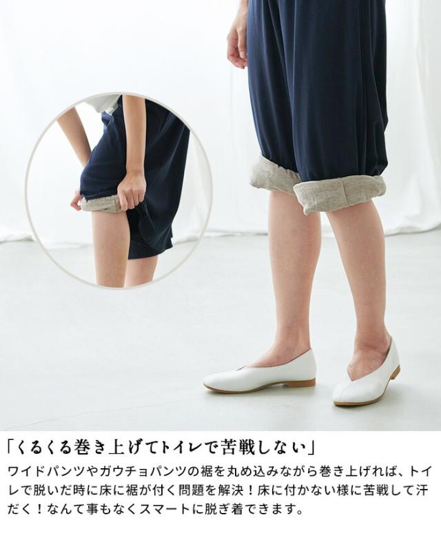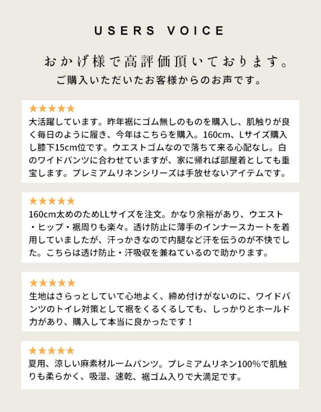 特徴 さらりと快適な履き心地で大変ご好評いただいている「プレミアムリネン®ペチパンツ」ですが、お客様から「もう少し長い丈のものも欲しい」とのご要望からロング丈を作りました。さらに、裾にゴムを入れて、トイレのあの問題を解決!ワイドパンツやガウチョパンツって脱ぐとトイレの床に裾が付いてしまいますよね…裾を巻き上げればゴムで止まって床につかない機能も加えました。また、インナーとしてだけでなく、夏のお部屋着としても使える便利なアイテムです。