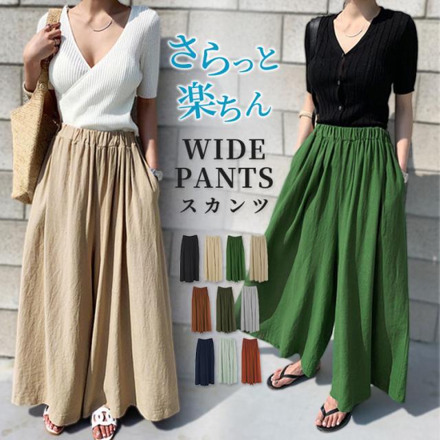 春新作 スカンツ ワイドパンツ レディース ボトムス ワイドルーズ ロング丈 体型カバー リネン ウエストゴム スカート風 無地 可愛い お洒落 カジュアル シンプル ワイルド キレカジ エレガント フェミニン ナチュラル 定番 普段使い 大人 薄手 大学生 女性用 デート 黒