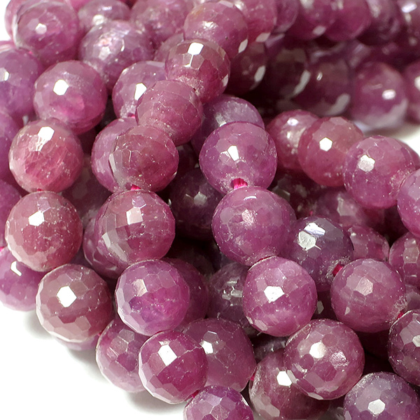 表面に施されたカット面がキラキラときらめく、原石由来の深みのある赤紫色が美しいルビーです。