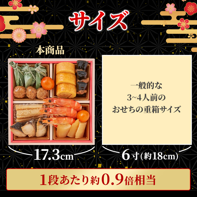 - 減塩じゃないのが何種類かあって、濃い味付けなのでそこは残念。 減塩とは言え、しっかりした味付けでした。 小さく区切ってある中にも、ちゃんと3人分の数が入ってるのは素晴らしいと思いました。 全て綺麗に詰めてあって、ただ解凍するだけなのは楽でしたが、年末年始の買い物でお重の場所の確保は大変なのは仕方ないですね。 以前、他店のですが真空パックの冷凍を解凍して自分で詰めるのは大変だったけど、場所を取らないのは楽でした。