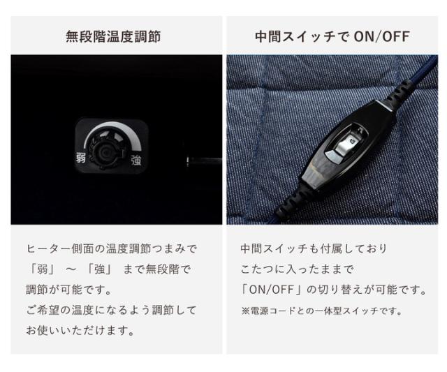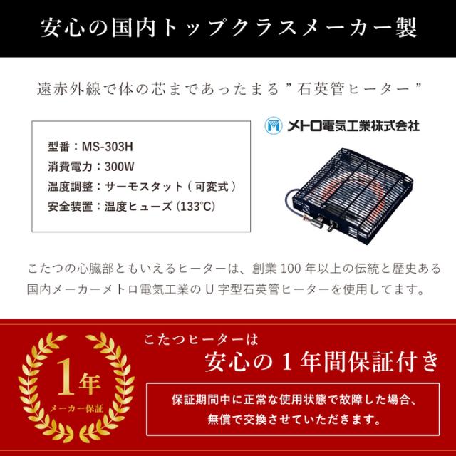 | ■ ヴィンテージテイストのこたつ台です。一人暮らしにもおすすめのコンパクトサイズで、オールシーズンご使用いただけます。 ■ こたつヒーターは安心のメーカー1年保証です。 ■ 安心のメトロ製ヒーターです。 ■ 中間電源スイッチ等、あると便利な機能付き。無段階温度調節が可能で、ご希望の温度になるように調節してご使用ください。 ※2025年9月より仕様が変更となっております。 ※ こたつ掛け布団、敷き布団は別売りです。 ※ 付属の取り扱い説明書を必ずお読みの上ご使用ください。 ※ こちらの電化製品につきまして、商品の特性上ご注文後の返品・交換はお受け致しかねます。あらかじめご了承ください。 ※ この製品は海外ではご使用になれません。変圧器をご使用いただいた場合でもご使用になれません。 ※ 掲載写真は表記サイズと異なる場合がございます。 ※ 画面上のカラーはご使用ブラウザやモニターの設定により、実物とは若干異なる場合がございます。あらかじめご了承の上、ご注文をお願いいたします。 |
