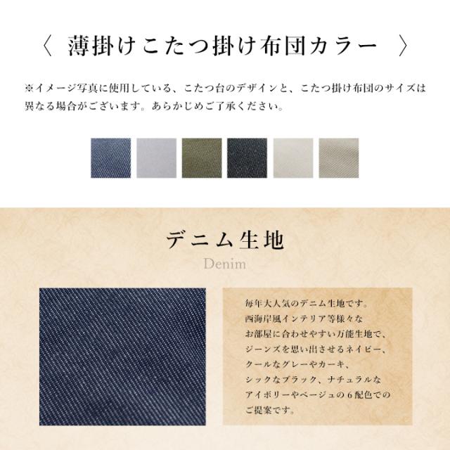 | こたつ掛布団:デニムネイビー/デニムグレー/デニムカーキ/デニムブラック/デニムアイボリー/デニムベージュ こたつ台:ブラウン/ブラック、ナチュラル/ホワイト |