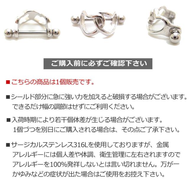 ヘリックス(軟骨上部)にかぶせるように装着するヘリックスシールドバーベルです。 耳たぶや軟骨にシールドをかぶせて、シールドの穴にバーベルを通して装着します。