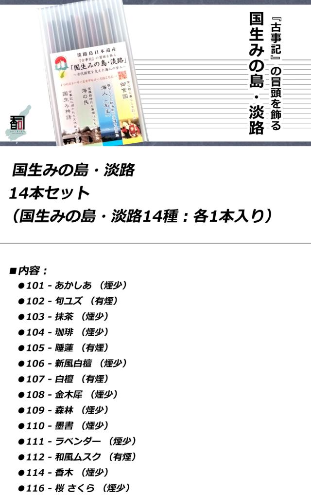 ■セット内容:14本セット(国生みの島・淡路 14種:各1本入り)(原材料等調合の具合により、香りの種類によってお香のサイズが異なります。)