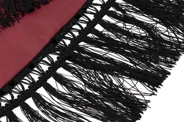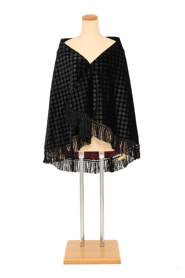 裾には長めの房飾りが施されており、上品で優雅な着こなしを引き立てます。留め具はスナップボタンが付いています。