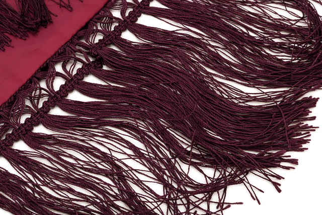 裾には長めの房飾りが施されており、上品で優雅な着こなしを引き立てます。留め具はスナップボタンが付いています。