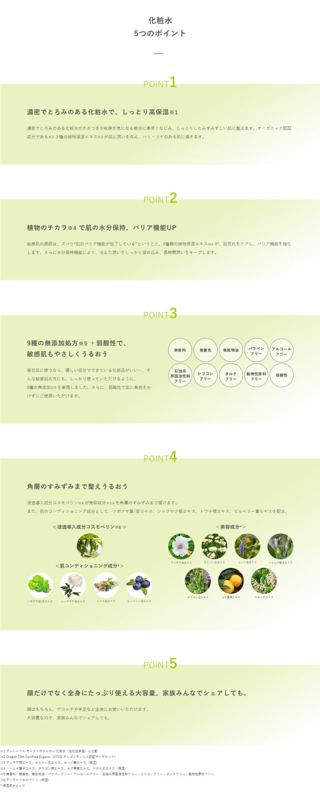 乾燥やストレスによってトラブルを起こしやすい敏感な肌に、3種類のオーガニック認証成分※1と植物保湿エキス※2がうるおいをたっぷり与えて保護します。さらに浸透導入成分コスモペリン※3が美容成分※1,2を角層のすみずみまで届けます。