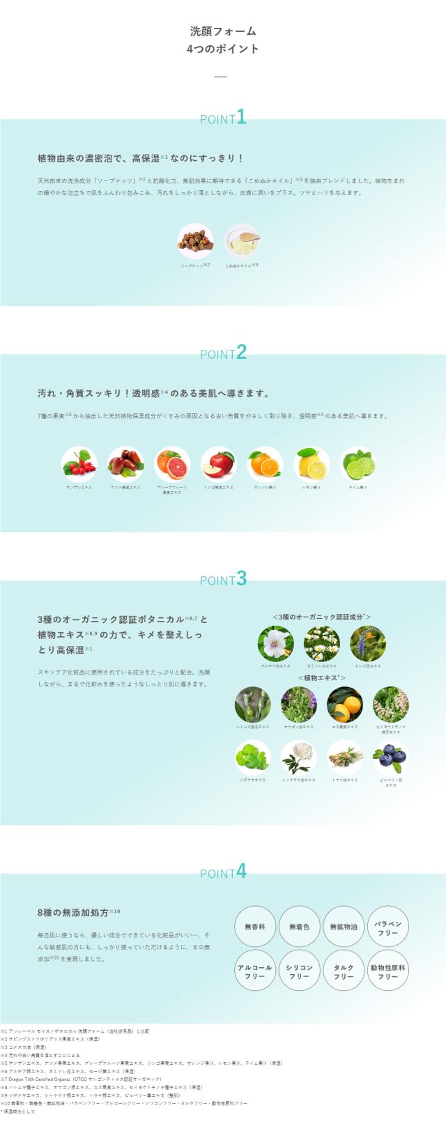 | 成分 | 【全成分】水、グリセリン、ミリスチン酸、PEG-8、ステアリン酸、水酸化K、ラウリン酸、サンザシエキス、ナツメ果実エキス、グレープフルーツ果実エキス、リンゴ果実エキス、オレンジ果汁、レモン果汁、ライム果汁、シア脂、アルテア根エキス、カミツレ花エキス、セージ葉エキス、アーチチョーク葉エキス、エナンチアクロランタ樹皮エキス、サピンヅストリホリアツス果実エキス、コメヌカ油、ハトムギ種子エキス、オウゴン根エキス、ユズ果実エキス、セイヨウトチノキ種子エキス、ツボクサエキス、シャクヤク根エキス、トウキ根エキス、ビルベリー葉エキス、オレアノール酸、パルミチン酸、コカミドDEA、コカミドプロピルベタイン、セタノール、ポリクオタニウム-7、ステアリン酸グリセリル、ステアリン酸グリセリル(SE)BG、EDTA-4Na、ジステアリン酸グリコール、フェノキシエタノール |