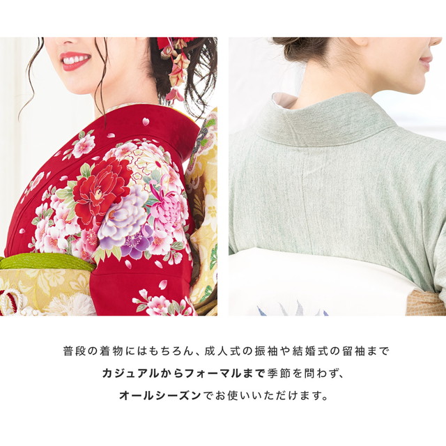 普段の着物にはもちろん、成人式の振袖や結婚式の留袖までカジュアルからフォーマルまで、季節を問わずオールシーズンでお使いいただけます。