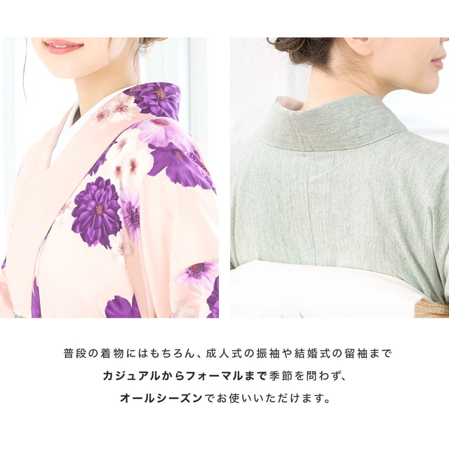 普段の着物にはもちろん、成人式の振袖や結婚式の留袖までカジュアルからフォーマルまで、季節を問わずオールシーズンでお使いいただけます。