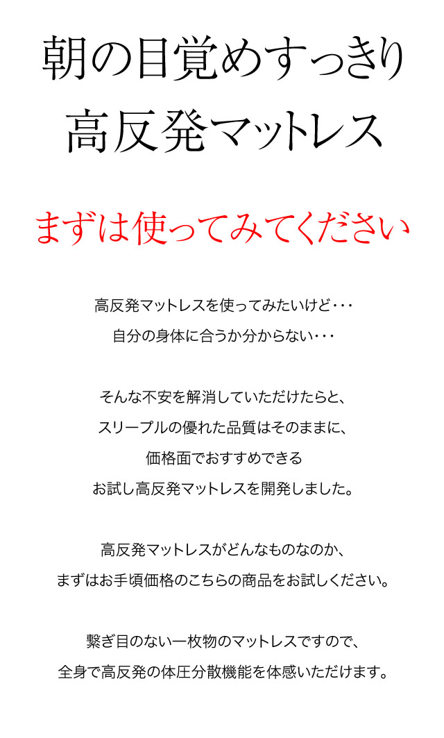 お試し 高反発マットレス シングル スリープル SLEEple 3cm オーバーレイ トッパー 敷き布団 ベッドマット 寝具 睡眠 理想の寝姿勢 快眠 体圧分散 腰痛 肩こり コンパクト