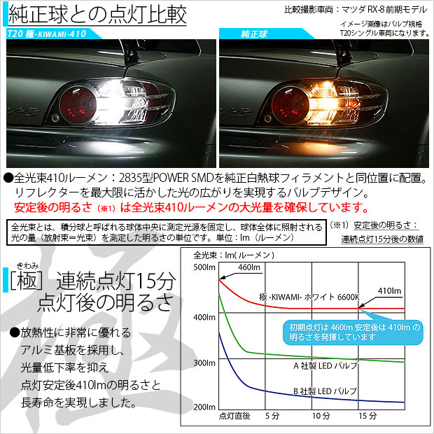 2835型POWER SMDを16個マウントしリフレクターを最大限に活かす強烈でワイドな照射光を可能にした「極-KIWAMI-」LEDバルブシリーズです。 純正白熱球フィラメントと同位置にSMDを配置。理想的な光の広がりを実現しました。LEDバルブ1球で明るさ全光束410ルーメン(lm)のスペックのバックランプ専用T20シングルウェッジ球。 バックランプとして必要十分な光量を確保しています。 | ||||