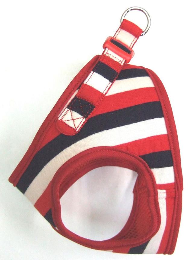 お洒落なボーダー柄をプリントしたコットン生地と、内側にメッシュ加工したナイロン生地を使用し、通気性の良いソフトなハーネスです。