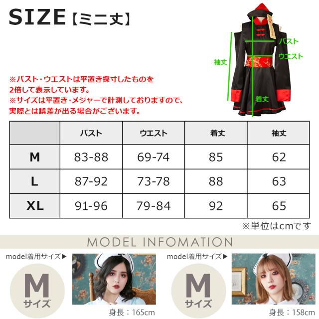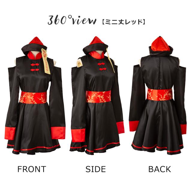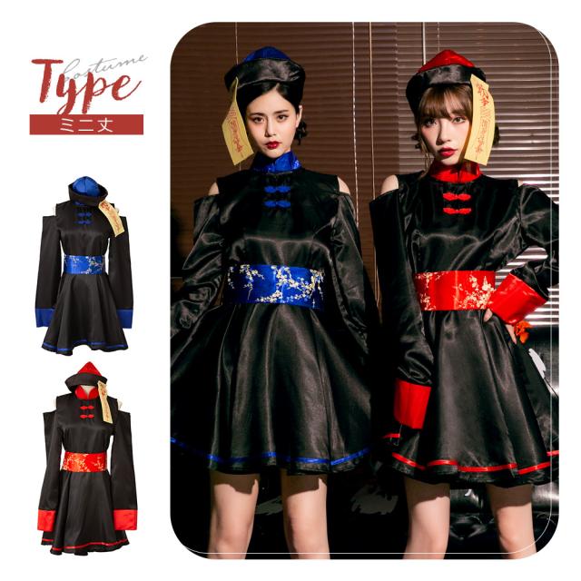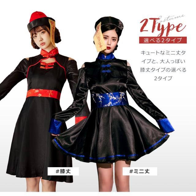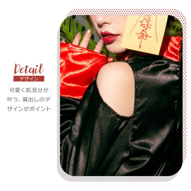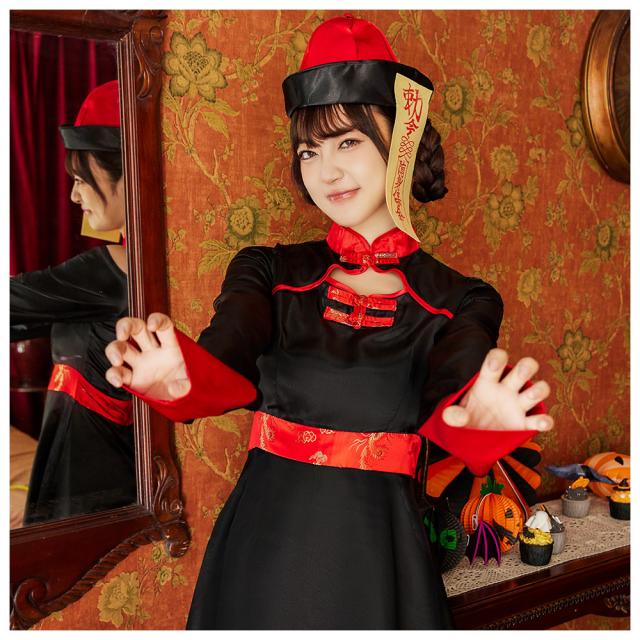 いつでも定番人気のキョンシーコスチュームが、大人っぽいスッキリシルエットが特徴の膝丈タイプと、キュートなミニ丈タイプの選べる2タイプになって新登場。腰でキュッと絞ったスタイルにふわっと広がるスカートがとってもキュートな一着です。可愛く肌見せが叶う、肩出しのデザインもポイント。
