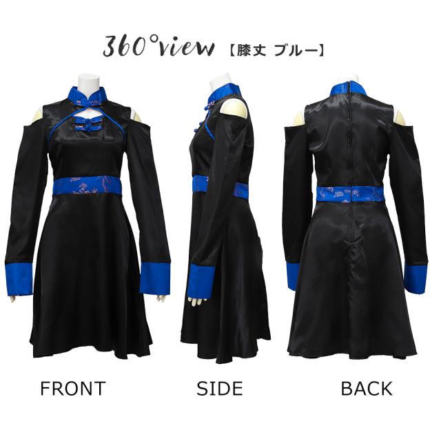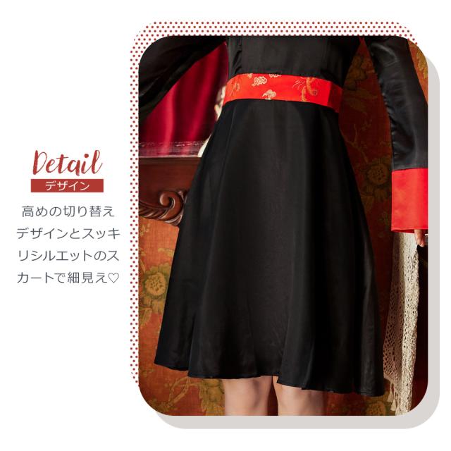 膝丈タイプは、高めの切り替えデザインとスッキリシルエットのスカートでスタイルを良く見せてくれます。また、中華風の飾りと、鎖骨部分が空いたデザインで胸元をオシャレに。ミニ丈タイプは、ウエスト部分は帯でキュッと締めてウエストマークできます。襟元には中華風の飾りをあしらい、豪華な仕上がりに。