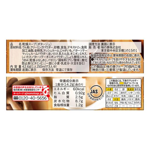 | でん粉、クリーミングパウダー、砂糖、食塩、デキストリン、食用加工油脂、全粉乳、マッシュルーム、じゃがいも、バターソテーマッシュルームパウダー、まいたけ、乳たん白、オニオンエキス、しいたけ、バターソテーオニオンパウダー、こしょう、酵母エキス、うきみ(乾燥ぶなしめじ、パセリ)/調味料(アミノ酸等)、酸化防止剤(ビタミンE)、(一部に小麦・乳成分・大豆を含む) |