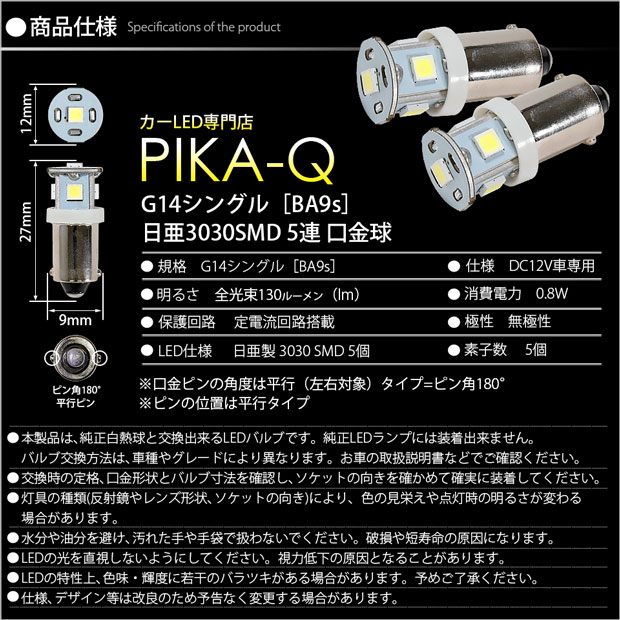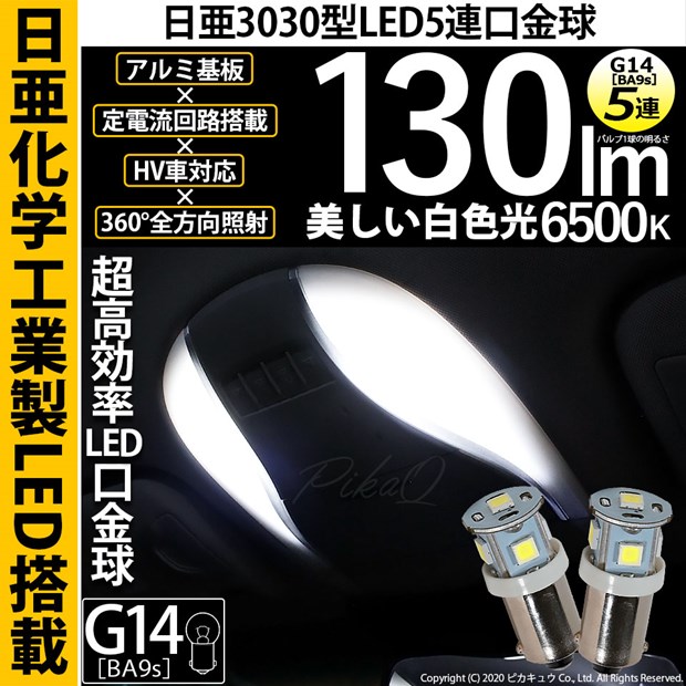 日亜化学工業製素子使用 130lmの大出力 G14シングル[BA9s] 日亜3030 5連 口金球 LEDカラー:ホワイト 色温度:6500K 1セット2個入り | ||||