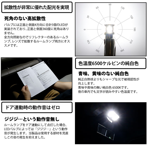 ルームランプをドア連動にして点灯した場合、LEDバルブによってはノイズが出る場合があります。当製品は使用する部材を見直しノイズの発生を抑えました。 | |||