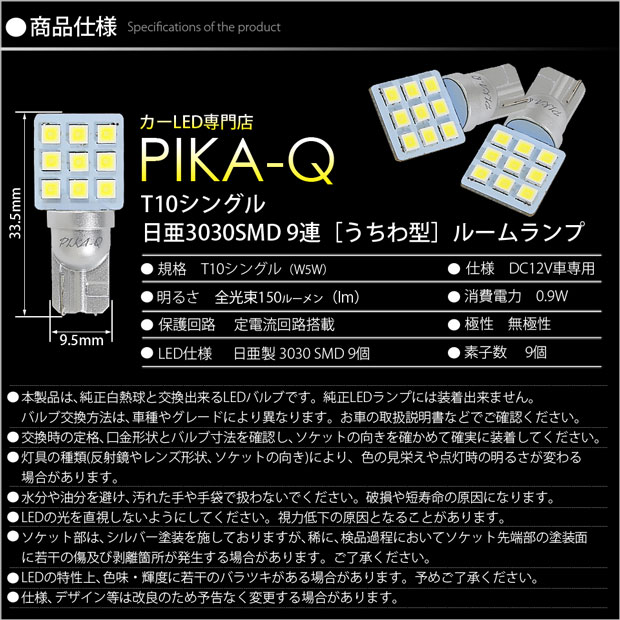 単 T10 LED ルームランプ用LED 日亜3030 9連 うちわ型 ルームランプ用ウェッジバルブ 150lm ホワイト 無極性 1セット2個入 11-H-22