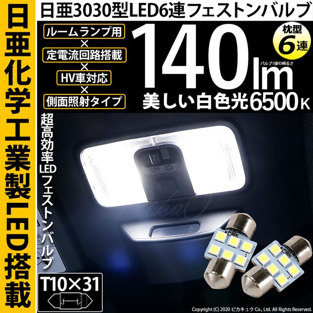 日亜化学工業製素子使用 140lmの大出力 T10×31 日亜3030 6連 枕型 ルームランプ用 LEDフェストンバルブ LEDカラー:ホワイト 色温度:6500K 1セット2個入り | |||