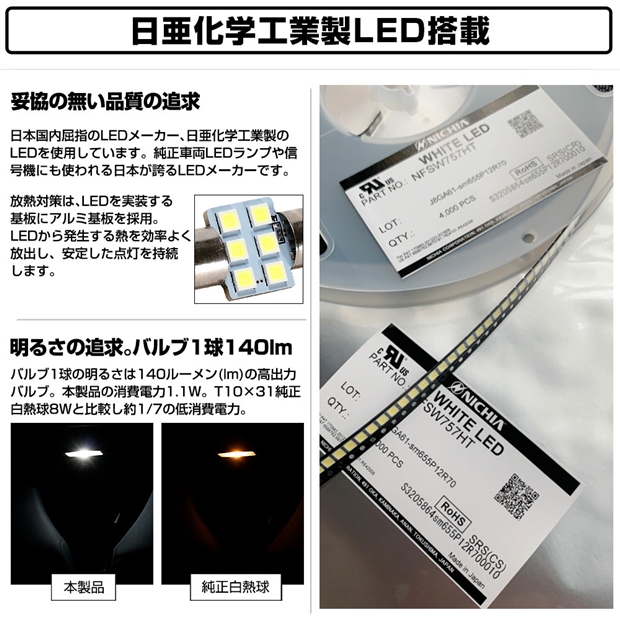 日亜化学工業製 3030 LEDを使用したルームランプ用T10×31規格のバルブです。明るさ140lmです。