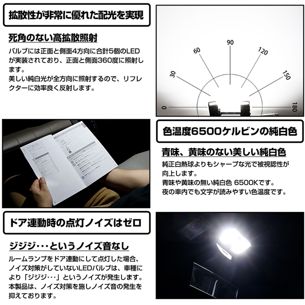 ルームランプをドア連動にして点灯した場合、LEDバルブによってはノイズが出る場合があります。当製品は使用する部材を見直しノイズの発生を抑えました。 | |||