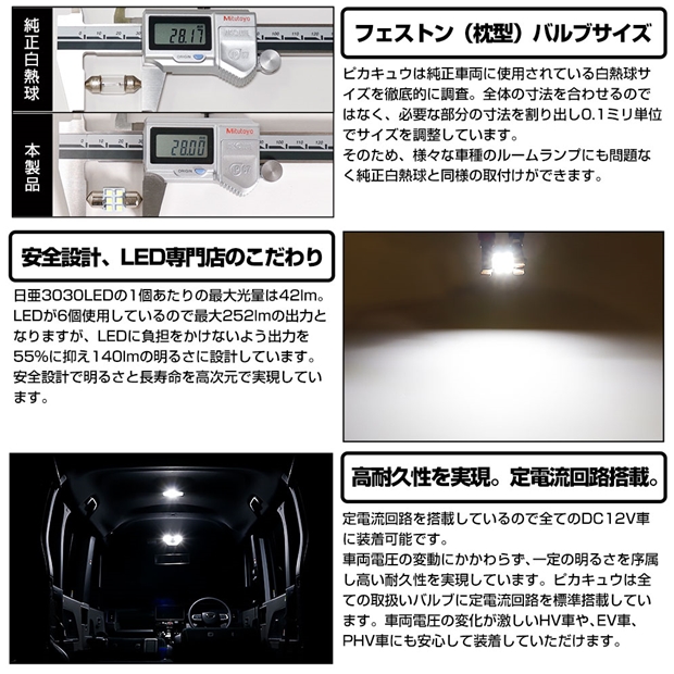 | ピカキュウ,LED専門店,LEDバルブ,LED,SMD,T10,W5W,日亜化学工業,日亜,3030,ルームランプ,爆光,140lm,140ルーメン,ROOM |