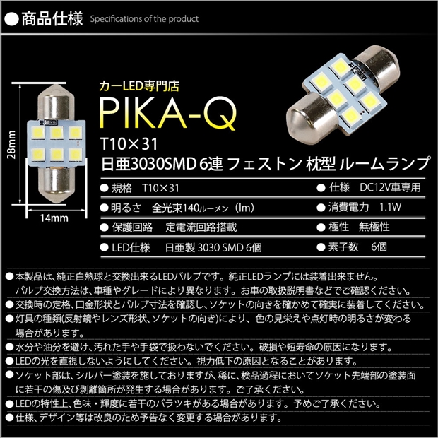 | ピカキュウ,LED専門店,LEDバルブ,LED,SMD,T10,W5W,日亜化学工業,日亜,3030,ルームランプ,爆光,140lm,140ルーメン,ROOM |
