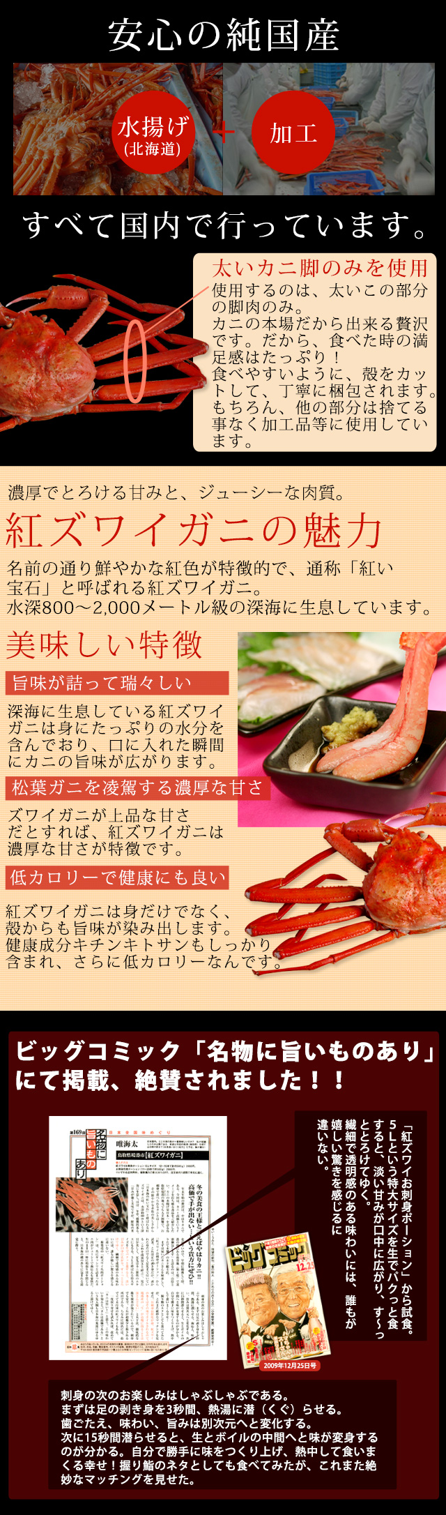 解凍するだけですぐにお召し上がりいただける、鮮度抜群の“生食用”かにむき身です。原料・製造はすべて国産の希少品。口の中です〜っととろける、紅ズワイガニならではの繊細で透明感のある味わいをお楽しみください。[お歳暮 お中元 ギフト プレゼント]