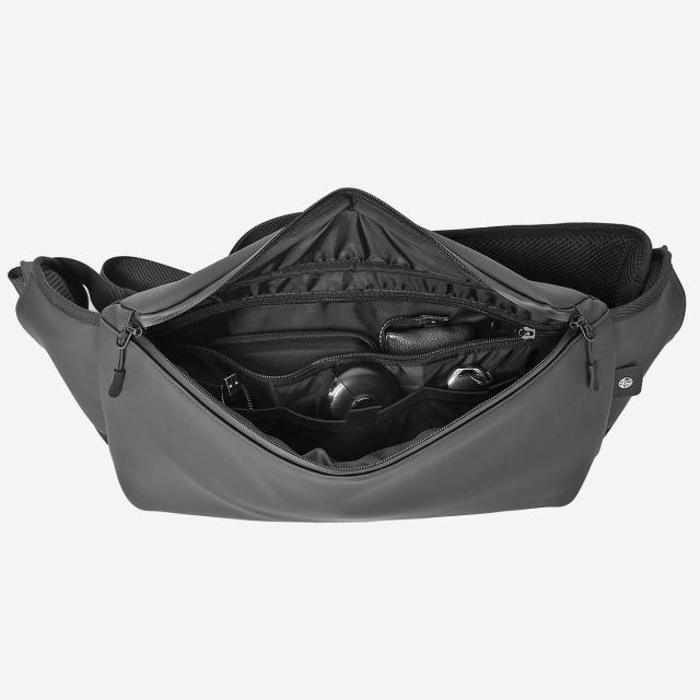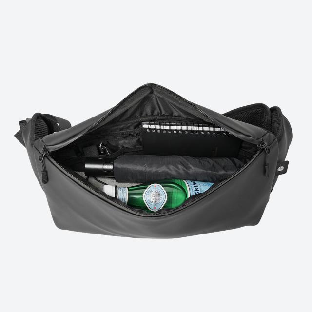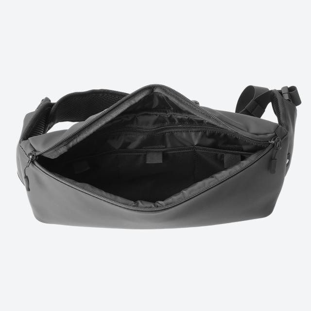 襷(たすき)のように身体にピタッと収まる「薄マチ設計」です。動きやすさはもちろん、周囲の邪魔にならないので余計なストレスもかかりません。荷物を出し入れする際は"クルっ"と前にバッグを持ってきて、快適に出し入れができます。