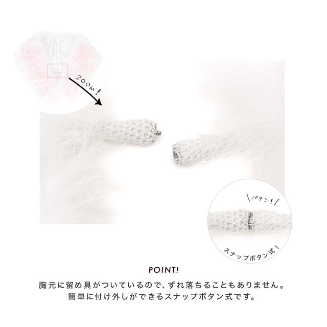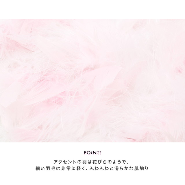 アクセントの羽は花びらのようで、細い羽毛は非常に軽く、ふわふわと滑らかな肌触りです。