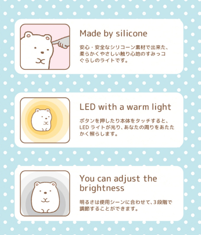 大人でも子供でも愛される人気の「すみっコぐらし」より、「しろくま」と「とかげ」のライト登場!シリコン素材で出来ているので柔らかく優しい触り心地が特徴のシリコン製のLEDライトです。ミニサイズでかわいさは一気にアップ!ぬいぐるみのように抱きしめることができます。電源ONから本体タッチで点灯、3段階で切り替えられる調光機能を備えており使いやすさもばっちり。あたたかい色のLEDライトが、あなたの周りを照らします!ベッド回りの補助灯やインテリアとしていかがでしょうか。