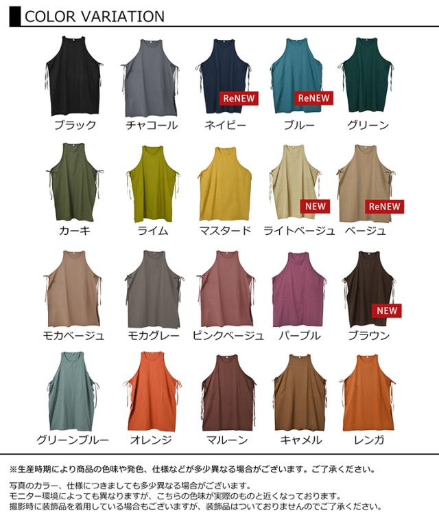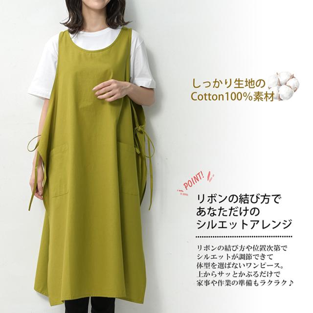 カラバリ豊富でギフトにもお勧め! 綿100%エプロンワンピース。 スポッと着るだけで抜け感のあるスタイルに。 サイドリボンの結び方を変えるだけで スッキリシルエットに変身できます。 |