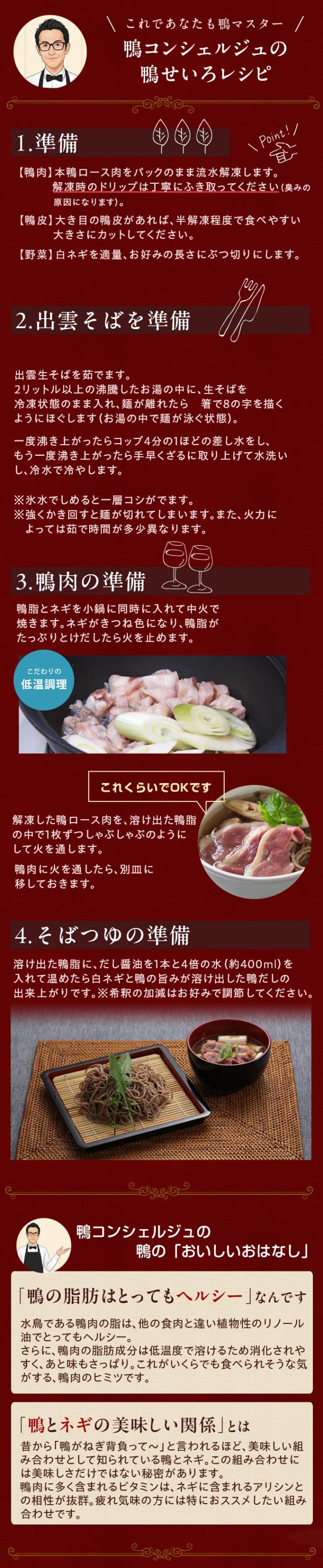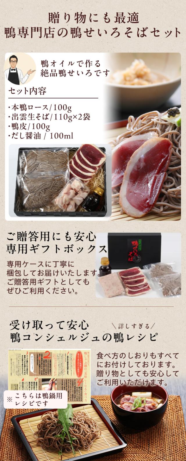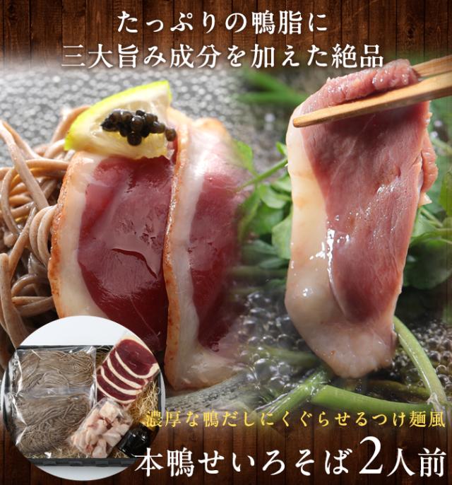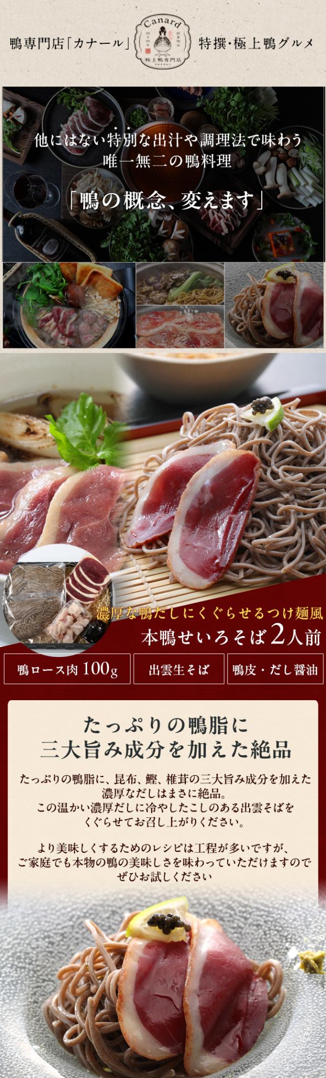 | 内容量 | 2人前(本鴨ロース肉100g、鴨皮100g、生そば110g×2袋、だし醤油100ml) |