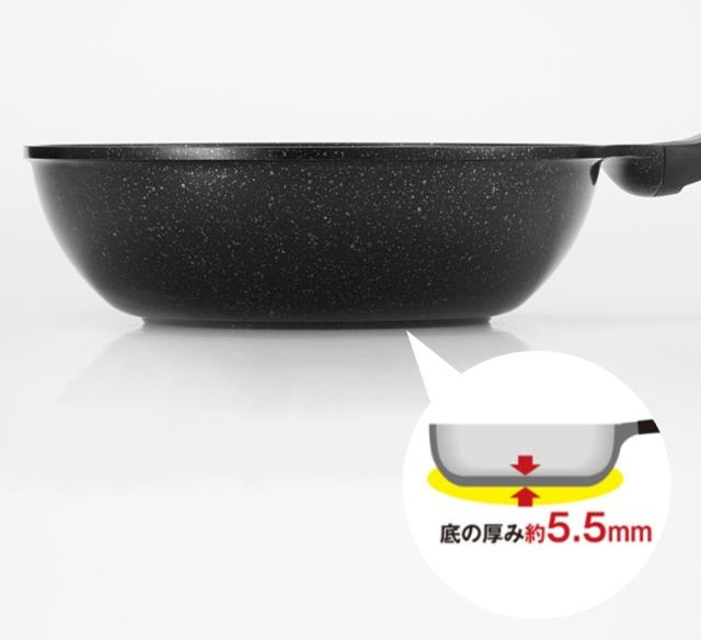 底厚は約5.5mmの肉厚設計となっており、蓄熱性に優れています。保温力があり食材に均等に火が入るため、煮込み料理も煮崩れせずおいしく仕上がります。また、油の温度が下がると失敗しやすい揚げ物料理も、高温度を保ってカラッと上手に揚げあげられます。