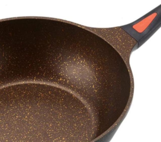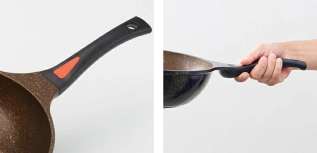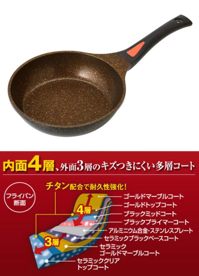 表面のゴールドマーブルコーティング(フッ素樹脂塗装)は、抜群の滑りの良さが自慢です。食材や調味料が焦げ付きにくく、少ない油で調理ができヘルシーで経済的。万一ソースが焦げ付いた場合も、お水でするんと落とせます。また、金属のヘラやトングが使える扱いやすさも魅力です。(角のとがったものは使用不可)