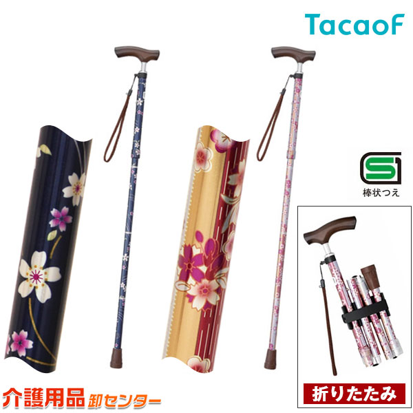 - 女性向きの上品な桜柄、握りやすい首細グリップの折りたたみステッキ。