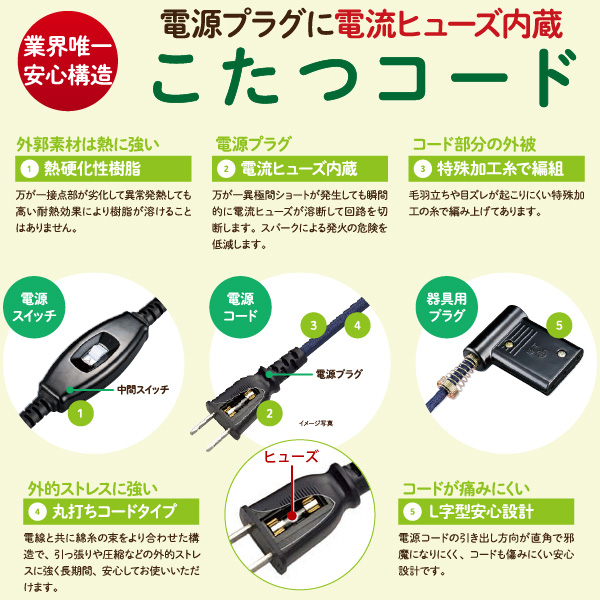 異常電流は電流ヒューズで遮断。丸打ちコードタイプ、L字型プラグでコードやプラグを保護。