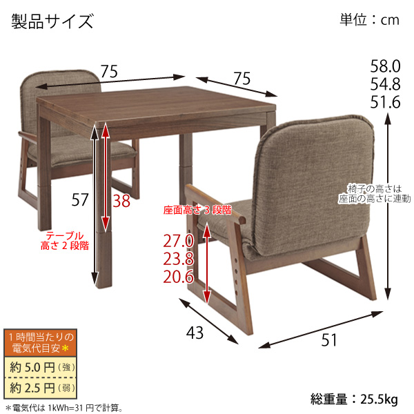 | サイズ | こたつ:幅75×奥行75×高さ38(57)cm |