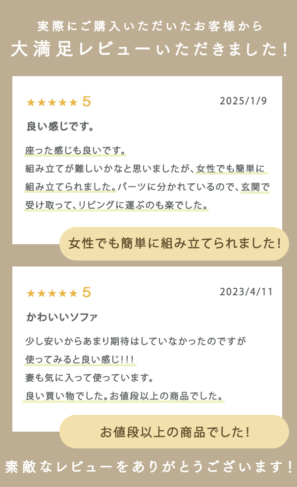 - ネットで大型家具を注文するのが初めてで不安でしたが、想像した通りのソファが届き安心しました。 配送の日にち指定をできるようにして欲しいです。