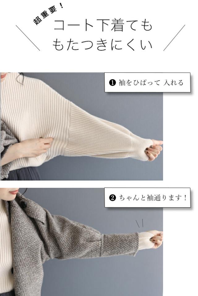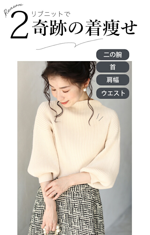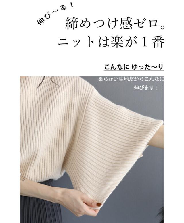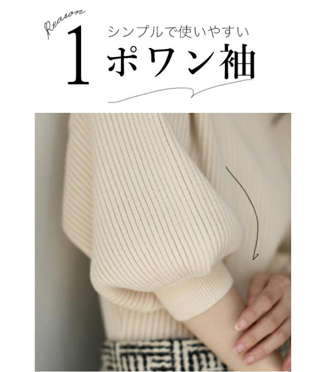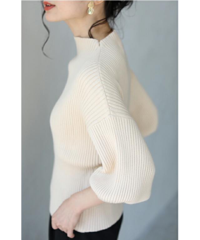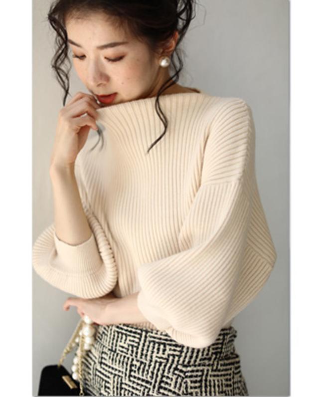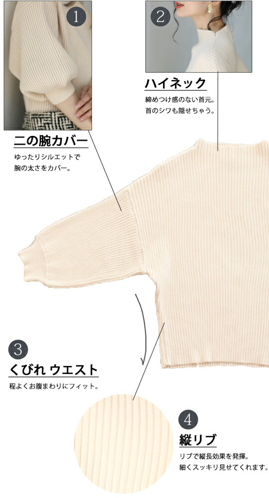 再入荷10月1日 袖ポワンとオフネックのニットトップス(S~L/2L~3L)(アイボリー)w8036-be cawaii ぽわん袖ニット ニット リブニット ハイネック 七分袖 五分袖 ゆるシルエットニット 体型カバー 春 秋 無地 大きいサイズ