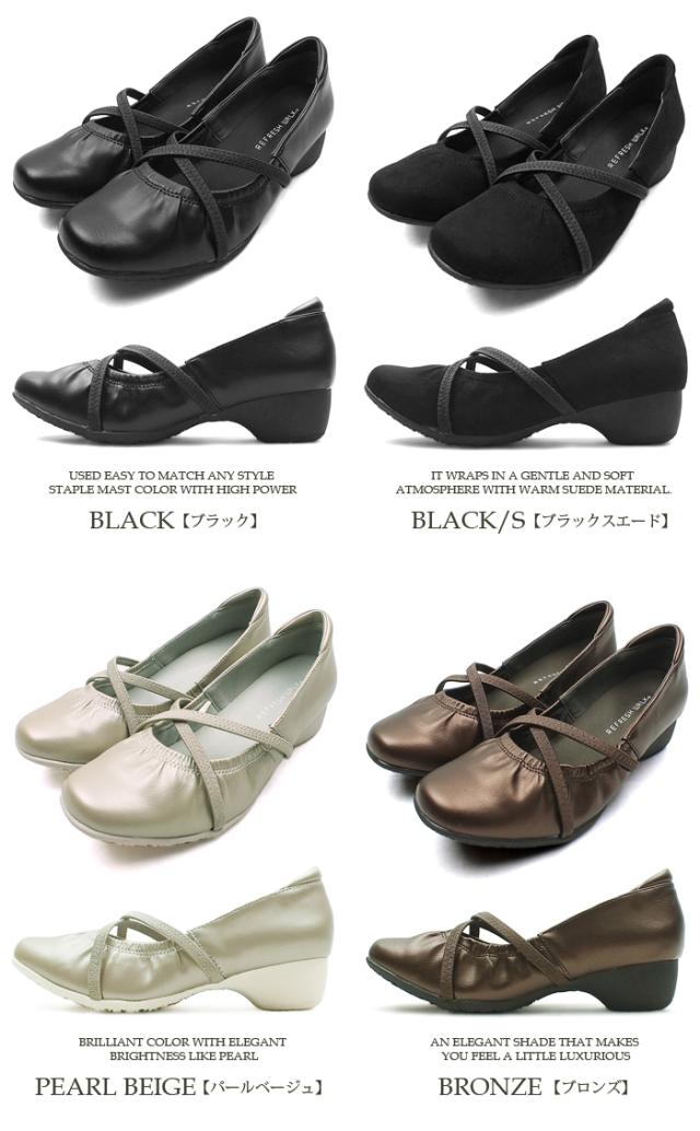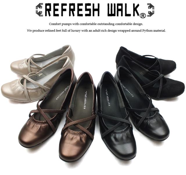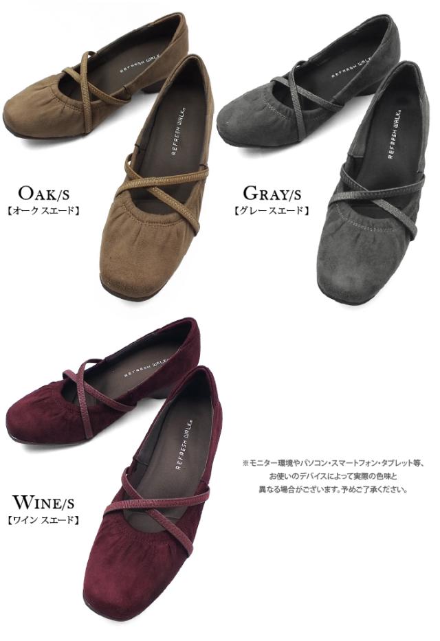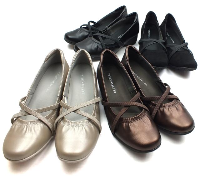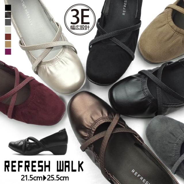 クロスゴムストラップ 甲ストラップ コンフォートパンプス ローヒールパンプス ウェッジソール ウエッジソール スクエアトゥ モールドソール 3E 幅広設計 外反母趾対策 痛くない 走れるパンプス 屈曲性 快適 送料無料 REFRESH WALK リフレッシュウォーク 1529