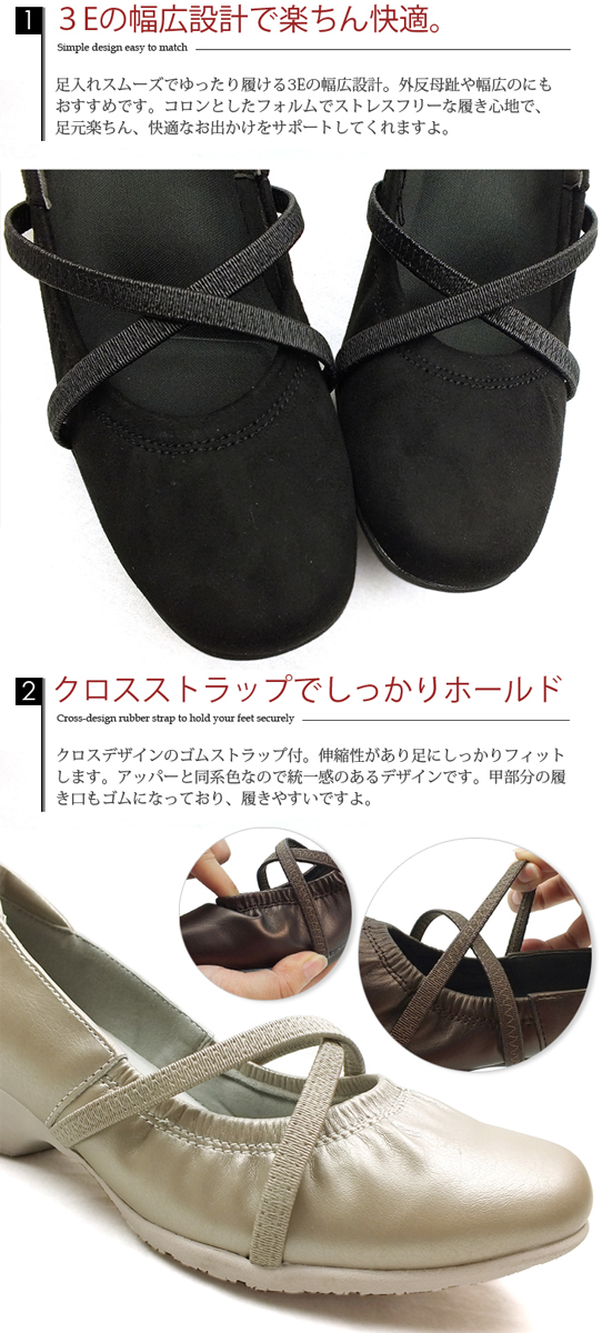 REFRESH WALK [リフレッシュウォーク] クソルゴムストラップで足をしっかりホールドしてくれるコンフォートパンプス。3Eの幅広設計で外反母趾の方も安心してお履き頂けます。広がる履き口には波型のステッチを施し、さりげないお洒落を演出。高さ3.5cmのモールドソールで安定感抜群で歩きやすいソールです。足の疲れを軽減する、ふわふわ立体クッションの機能性インソールで疲れにくく、優しく足を包み込んでくれます。かかとパッド内蔵で脱げにくい