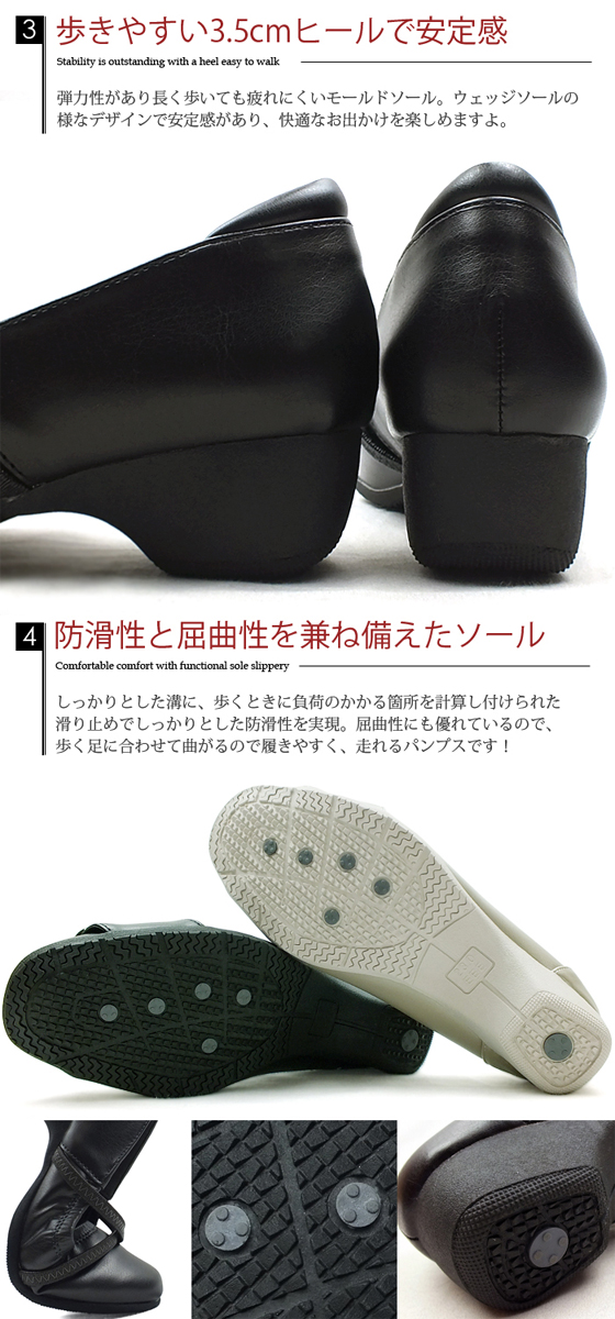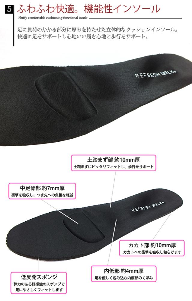 REFRESH WALK [リフレッシュウォーク] クソルゴムストラップで足をしっかりホールドしてくれるコンフォートパンプス。3Eの幅広設計で外反母趾の方も安心してお履き頂けます。広がる履き口には波型のステッチを施し、さりげないお洒落を演出。高さ3.5cmのモールドソールで安定感抜群で歩きやすいソールです。足の疲れを軽減する、ふわふわ立体クッションの機能性インソールで疲れにくく、優しく足を包み込んでくれます。