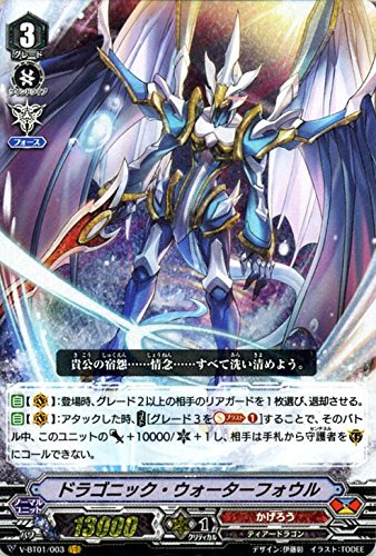 ★カードファイト!!ヴァンガード「結成!チームQ4」 ■カード名:ドラゴニック・ウォーターフォウル【VR】 ■種別:ノーマルユニット/グレード:3 ■クラン:かげろう ■パワー:13000 ■国家:ドラゴンエンパイア/種族:ティアードラゴン ■トリガー:-/スキル:ツインドライブ!! ■シールド:なし/クリティカル:1 ▼効果テキスト 【自】【(V)】:登場時、グレード2以上の相手のリアガードを1枚選び、退却させる。 【自】【(V)】:アタックした時、【コスト】[グレード3を【ソウルブラスト】(1)]することで、そのバトル中、このユニットのパワー+10000/クリティカル+1し、相手は手札から守護者を(G)にコールできない。 ■レアリティ:VR