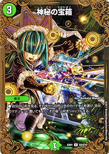 ★デュエルマスターズ「ゴールデン・ベスト」(DMEX01)収録 ■カード名:神秘の宝箱 ■レアリティ:レア ■種類:呪文 ■文明:自然文明 ■コスト:(3) [特殊能力] 自分の山札を見る。その中から自然以外のカードを1枚選び、自分のマナゾーンに置いてもよい。その後、山札をシャッフルする。