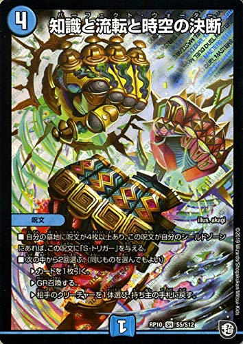 デュエルマスターズ超天篇第2弾「青きC.A.P.と漆黒の大罪」(DMRP10)収録 ■カード名:知識と流転と時空の決断 ■レアリティ:スーパーレア ■種類:呪文 ■文明:水文明 ■コスト:(4) [特殊能力] ■自分の墓地に呪文が4枚以上あり、この呪文が自分のシールドゾーンにあれば、この呪文に「S・トリガー」を与える。 ■次の中から2回選ぶ。(同じものを選んでもよい) ?カードを1枚引く。 ?GR召喚する。 ?相手のクリーチャーを1体選び、持ち主の手札に戻す。